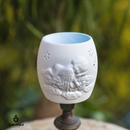 W uroczym stylu, przedstawiający białego cherubina śpiącego na chmurkach. Misa na olejek zabarwiona.